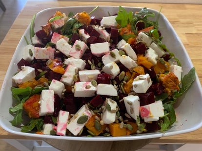 It has roasted pumpkin, baby beetroot, feta cheese and rocket, topped with sunflower seeds. Served with our vinaigrette.